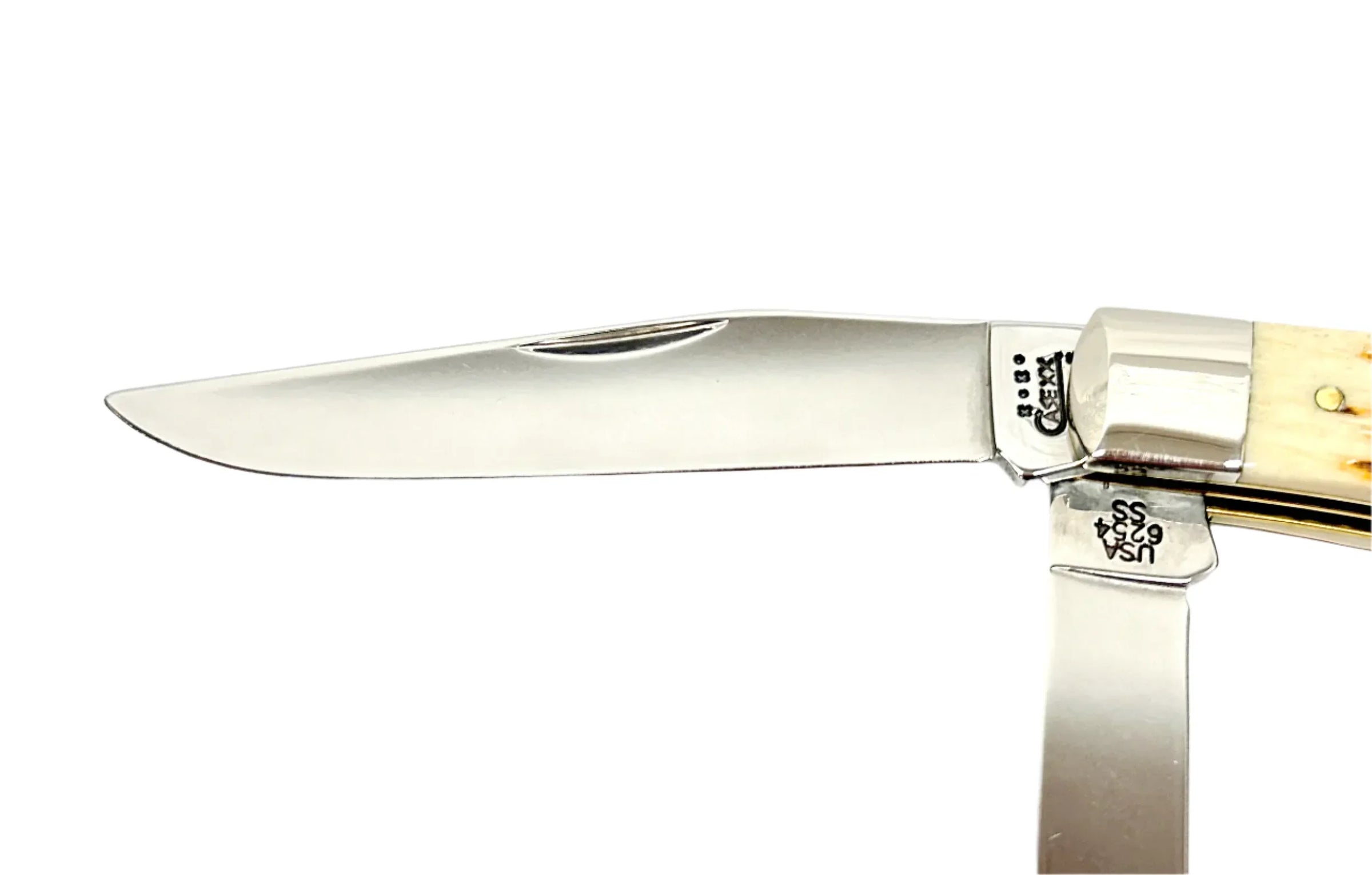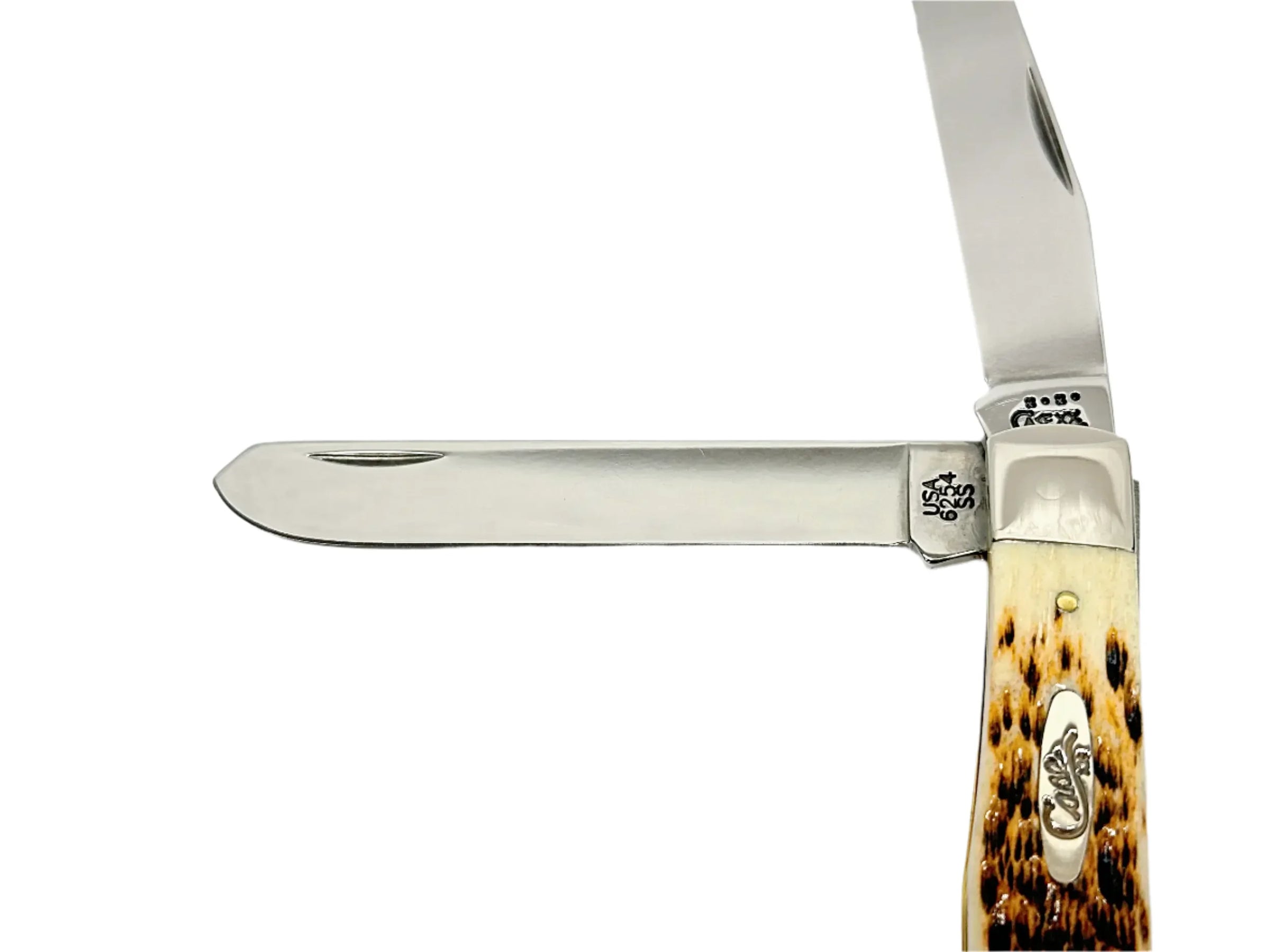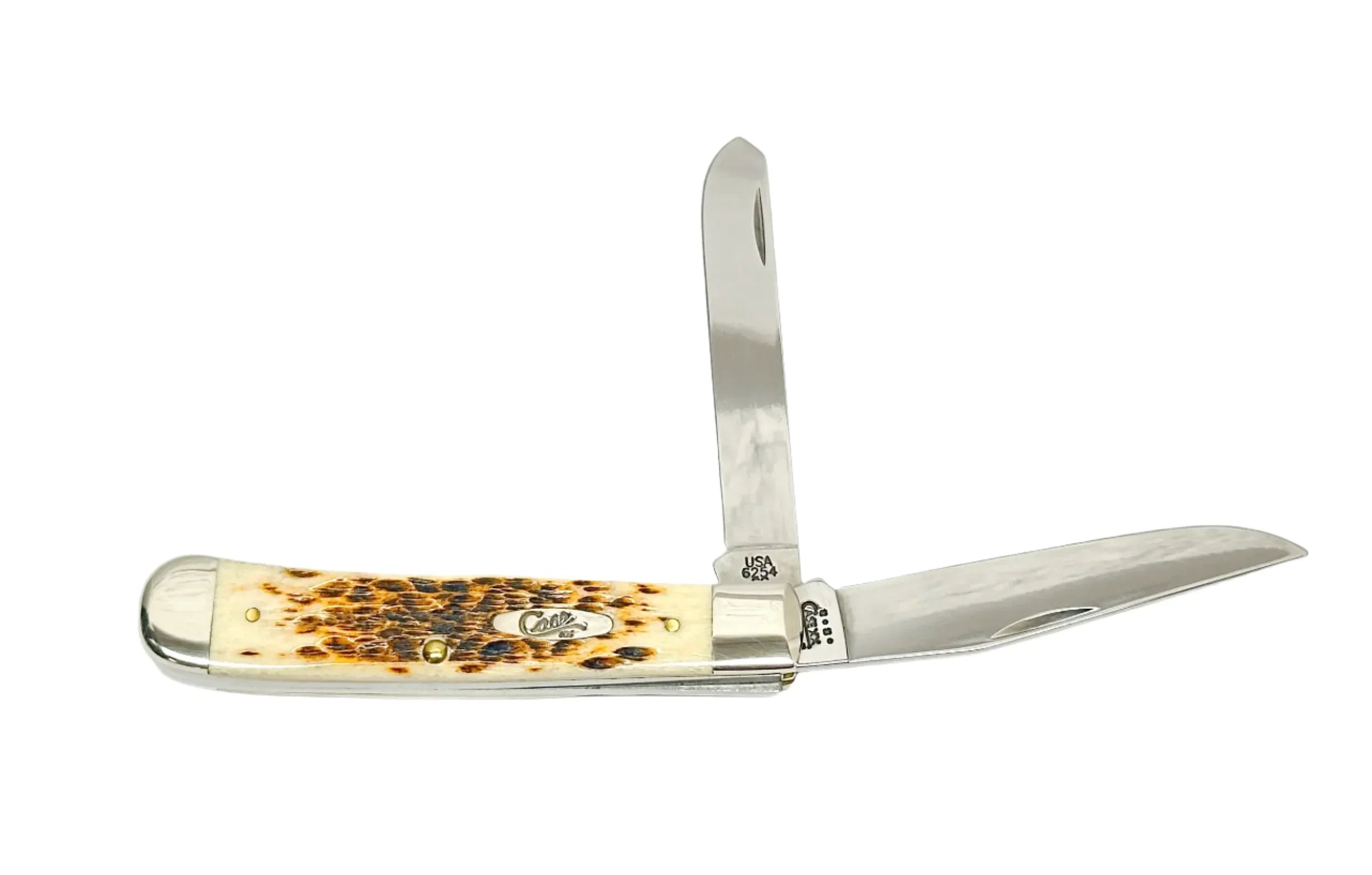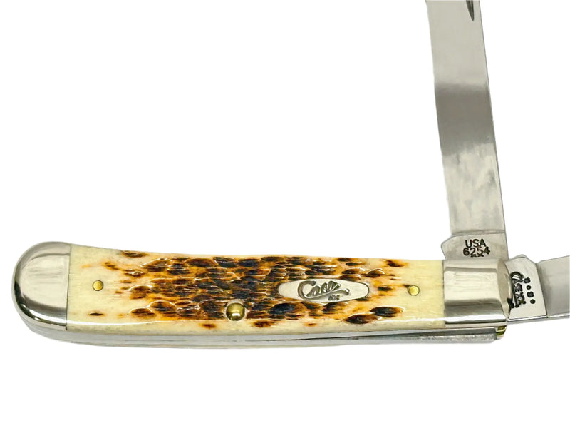 New 2001 Case XX 6254 trapper pocket knife with jigged amber bone scales. Comes in the original box with paperwork and has never been used, carried or sharpened.  In excellent condition.