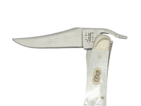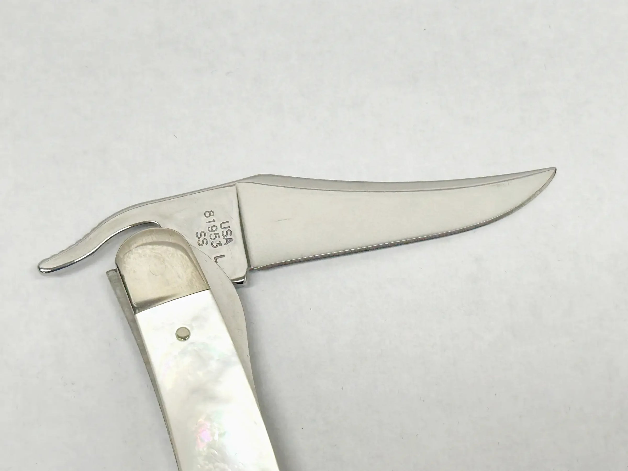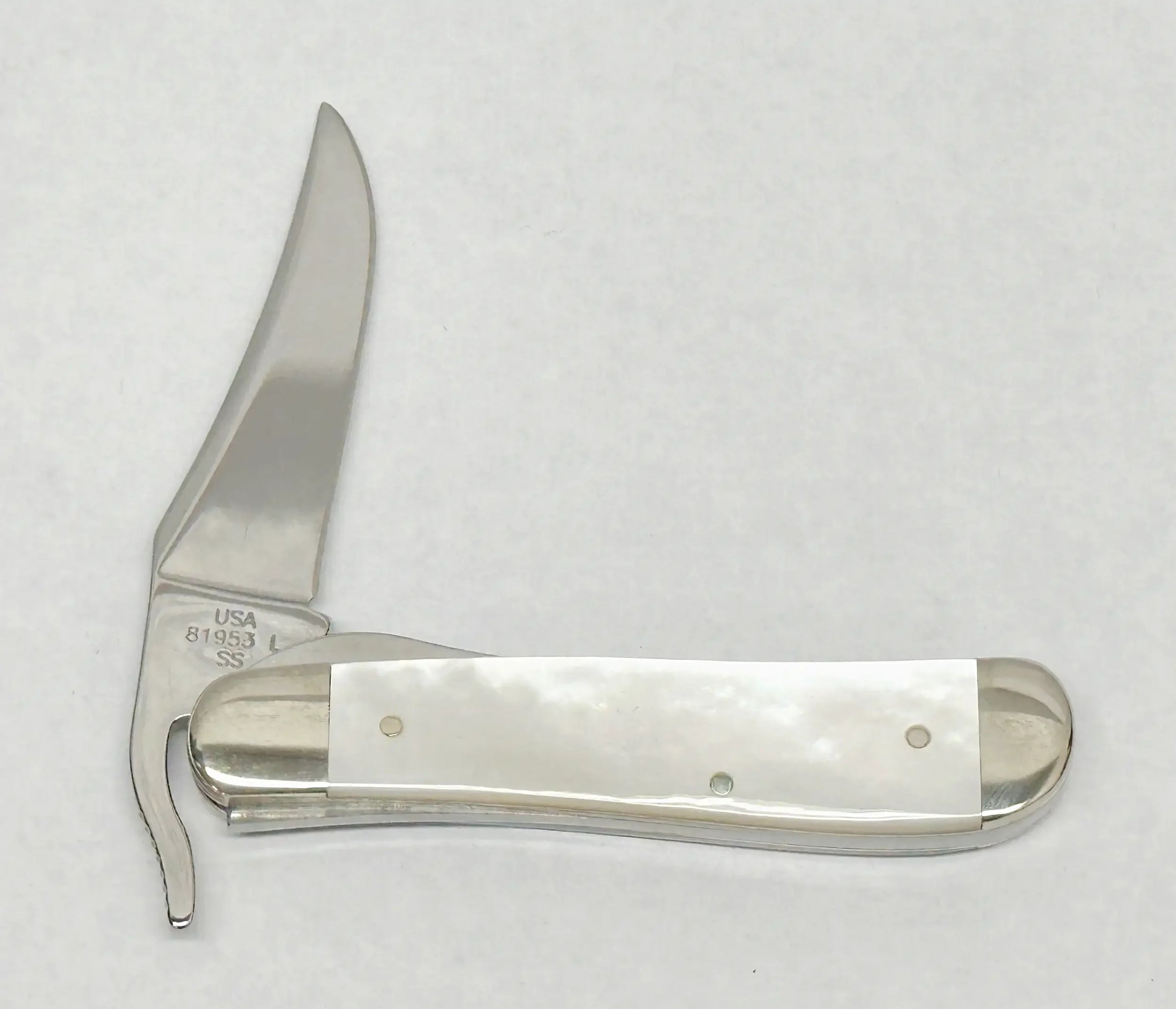 This pristine 2001 Case XX 81953L Russlock features exquisite Mother of Pearl scales and remains in factory-new condition. Never used, carried, or subjected to sharpening, this collector's piece is presented in its original packaging. The knife exhibits flawless condition, representing an exceptional example of Case's renowned craftsmanship.