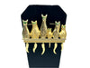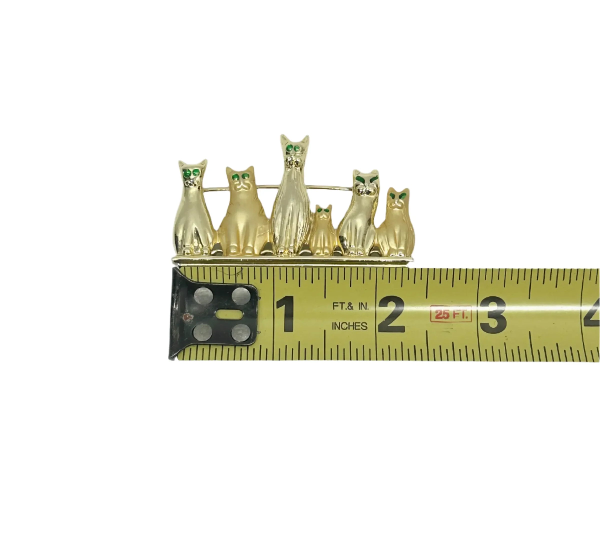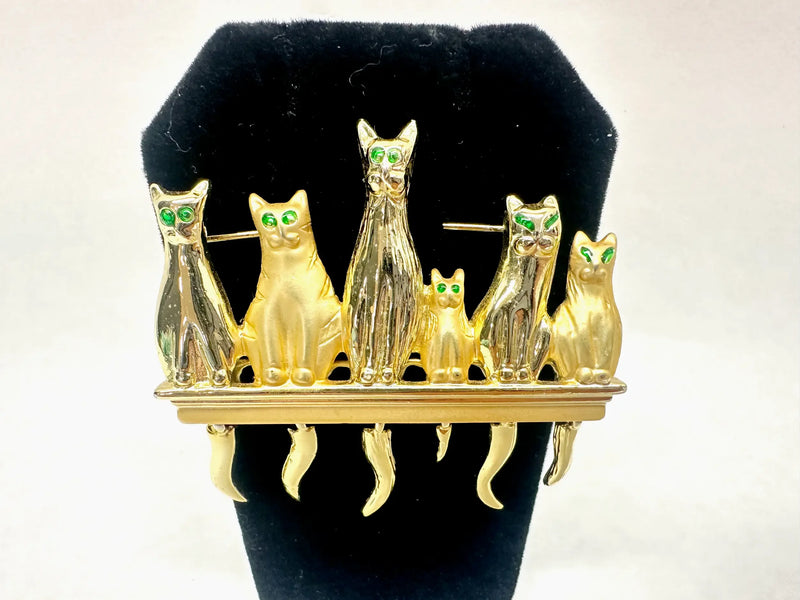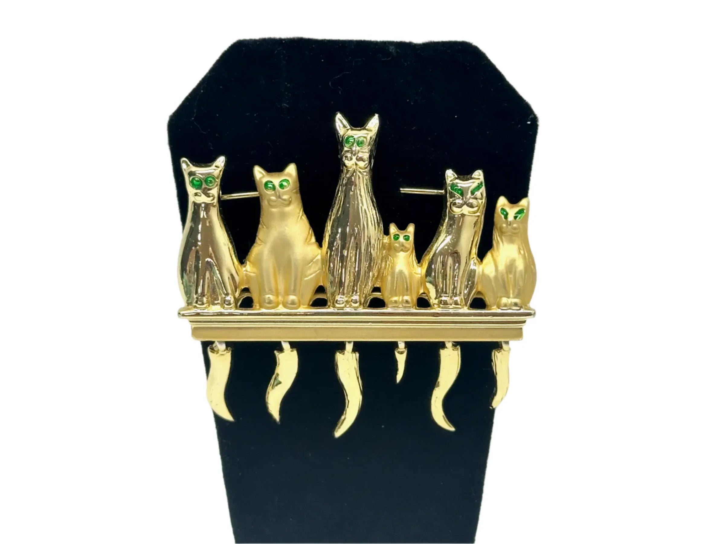 Sophisticated gold-tone feline brooch featuring multiple cats perched on a shelf, each with articulated tails that dangle and move freely. The piece showcases meticulous craftsmanship with smooth and satin finishes, striking green eyes, and bears the authentic AJC signature mark. Preserved in excellent vintage condition.