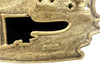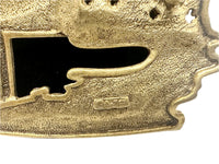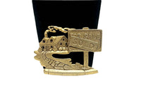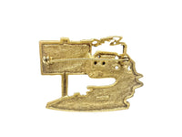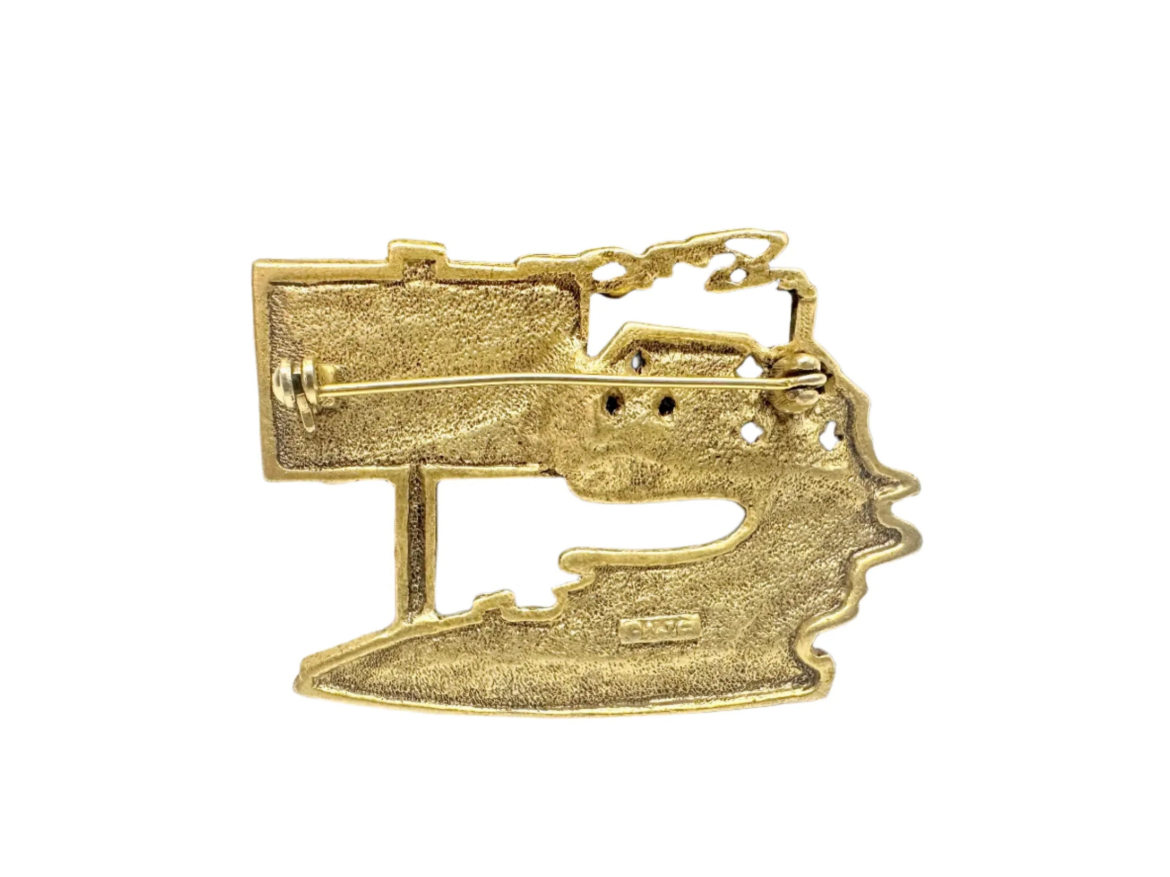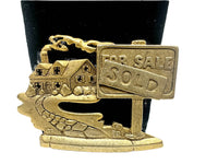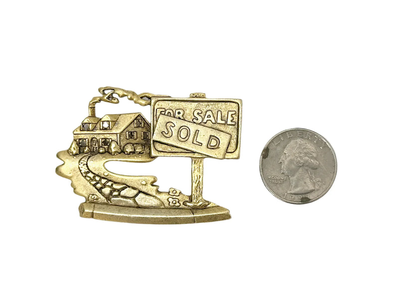 Expertly crafted AJC signature gold-toned brooch depicting a House For Sale/Sold sign. This collector's piece maintains impeccable condition, preserving its original detail and finish.