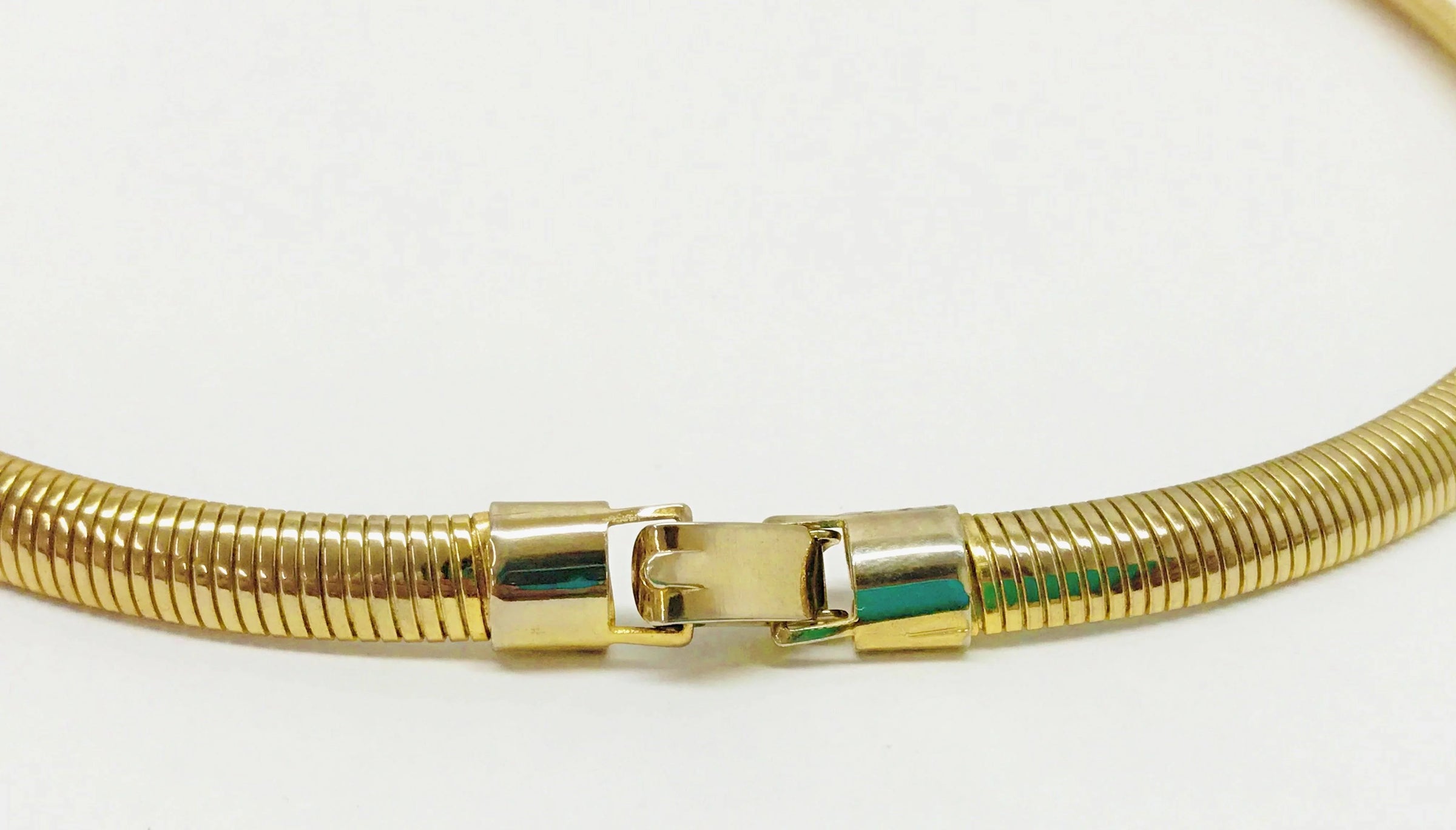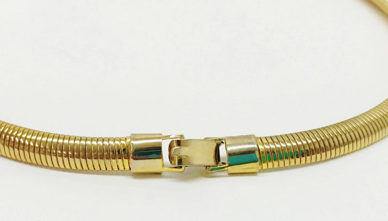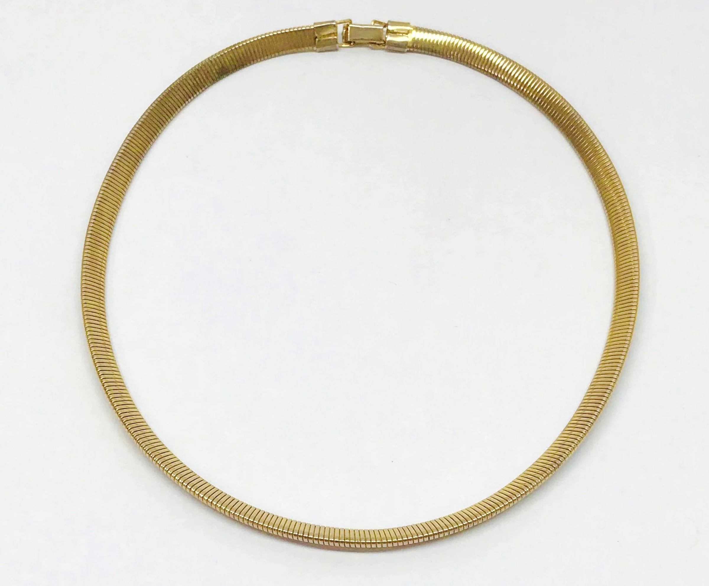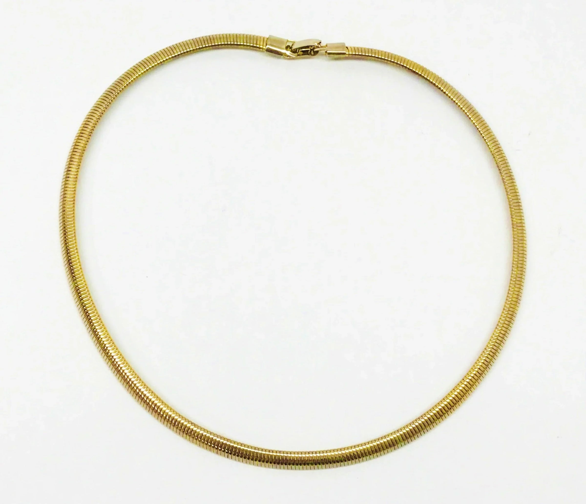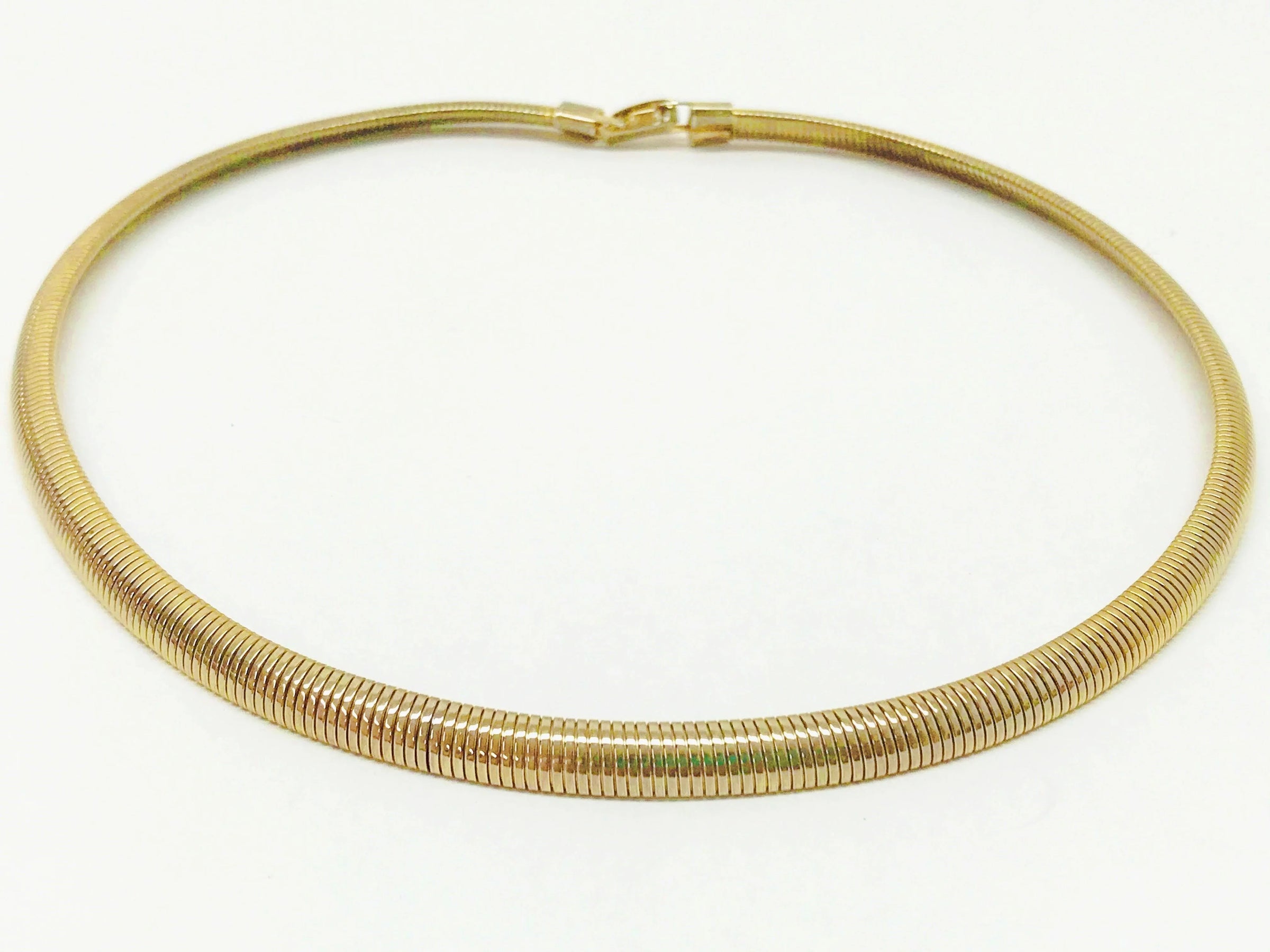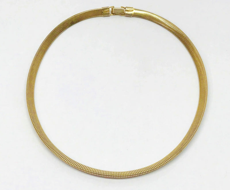 Gold tone coil necklace with a fold over clasp.  The coil necklace is in very good condition and measures 20" in length.