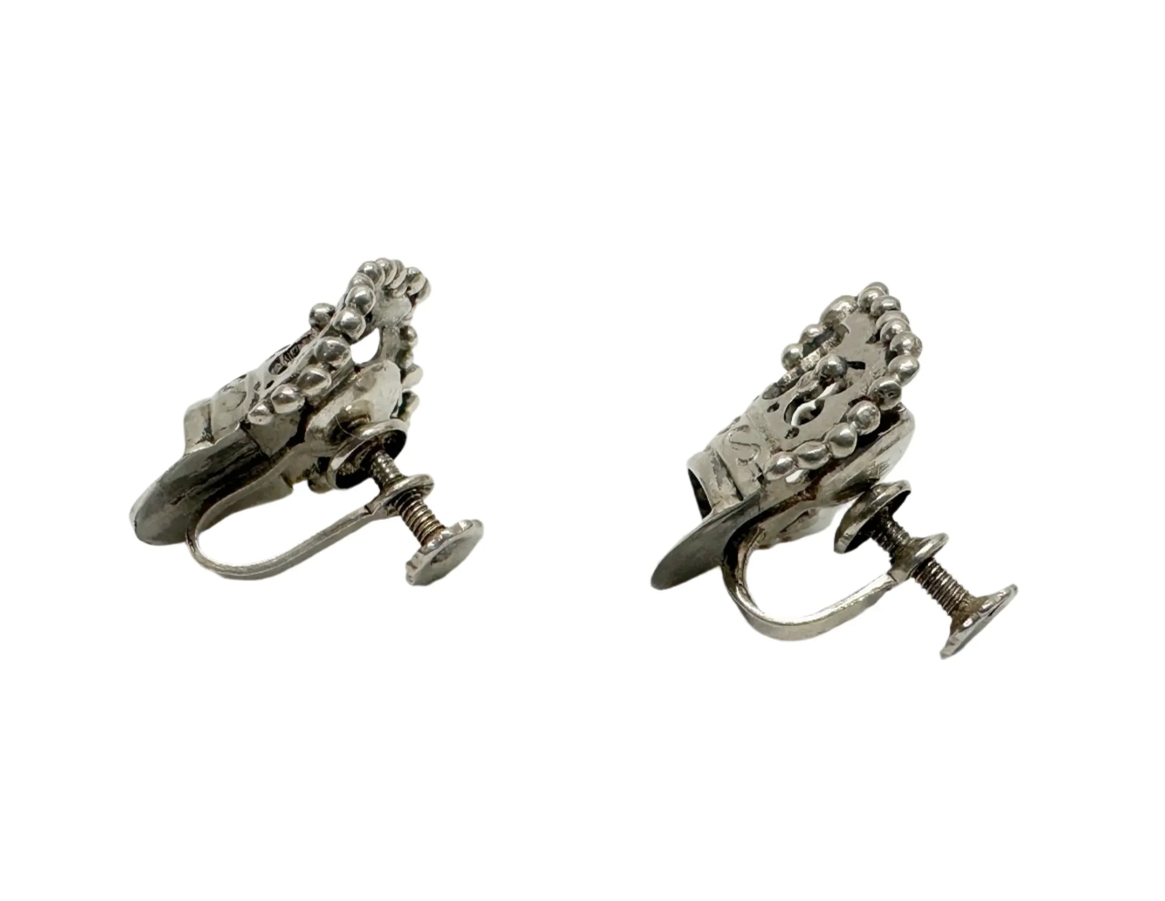 Expertly crafted sterling silver earrings featuring a regal crown design. These vintage screw back earrings showcase authentic Mexican silversmithing artistry and maintain excellent condition despite their age. A distinguished addition to any fine jewelry collection.